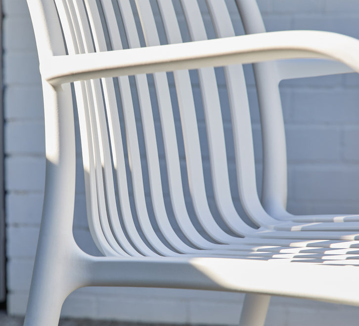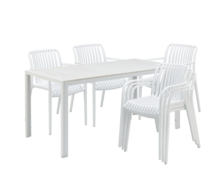 Includes 1 spacious slatted table and 6 streamlined chairs Weather-resistant treatment suitable for outdoor use UV stabilised to minimise fading when exposed to the sun Crafted with a sturdy metal frame Durable powder coat finish for enhanced longevity Polywood table tops make this set suitable for outdoor use