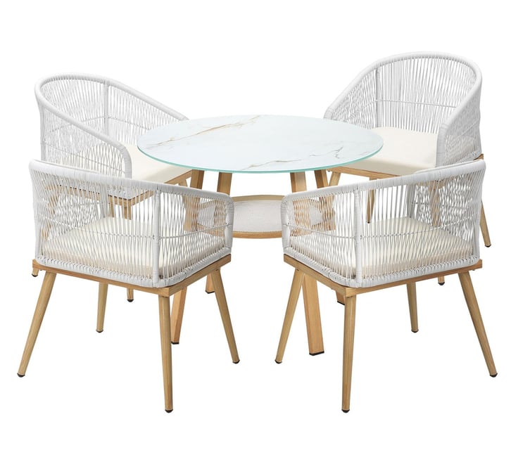 4 seater outdoor dining set White ceramic tempered glass tabletop for durability Sturdy steel frame construction Handy storage shelf beneath the table Thick padded seat cushions for added comfort Weather-resistant materials suitable for all seasons Versatile design for both indoor and outdoor use Simple assembly required Assembled Size: L 90cm...